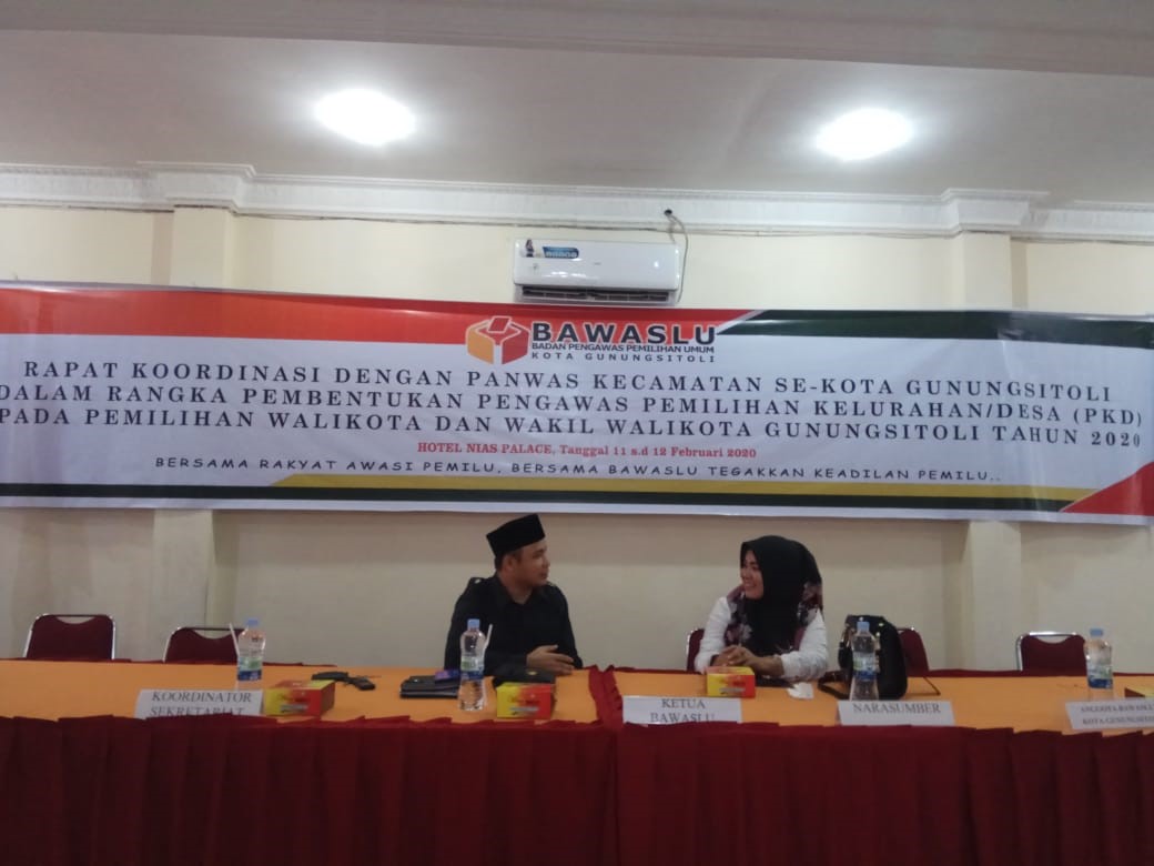 GUNUNGSTOLI, Bawaslu Kota Gunungsitoli gelar Rapat Koordinasi bersama Panwas Kecamatan se-Kota Gunungsitoli dalam rangka Pembentukan Pengawas Kelurahan/Desa (PKD) pada Pemilihan Walikota dan Wakil Walikota Gunungsitoli Tahun 2020. Bertempat di Hotel Nias Palace. Kegiatan tersebut dilaksanakan selama dua hari (selasa dan Rabu) tanggal 11 s.d 12 Februari 2020.