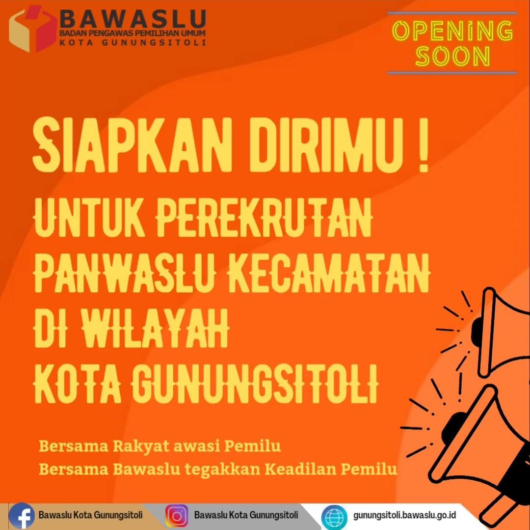 Bawaslu Kota Gunungsitoli akan membuka Perekrutan Panwaslu Kecamatan di enam Kecamatan di wilayah Kota Gunungsitoli, jangan lupa daftarkan diri anda sebagai Pengawas Ad-hoc di tingkat Kecamatan.