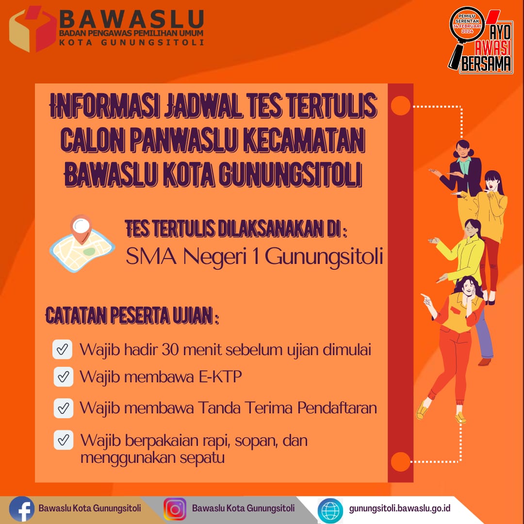 Berikut disampaikan jadwal pelaksanaan Ujian Tes Tertulis Calon Panwaslu Kecamatan