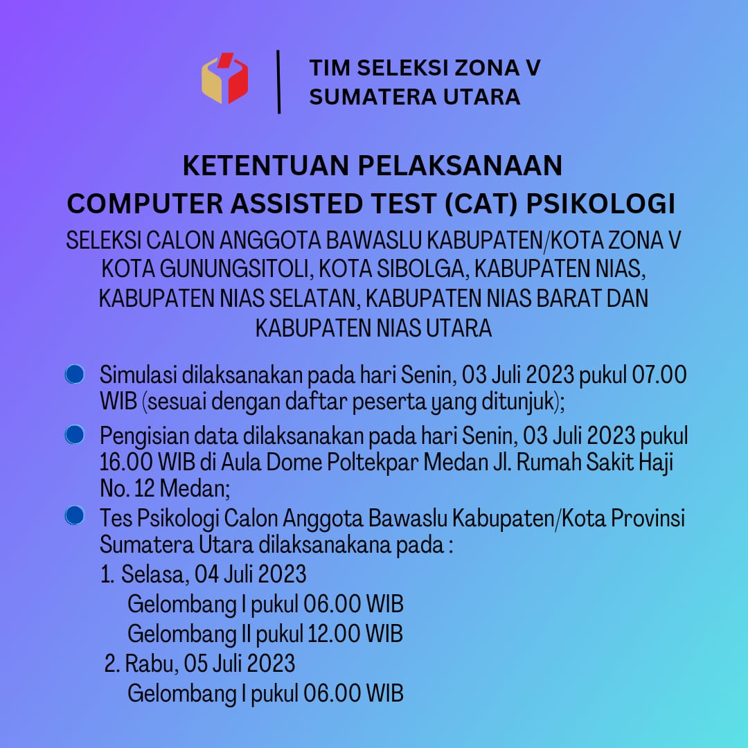 PENGUMUMAN GLADI DAN PELAKSANAAN TES PSIKOLOGI CALON ANGGOTA BAWASLU KAB/KOTA ZONA V SUMUT
