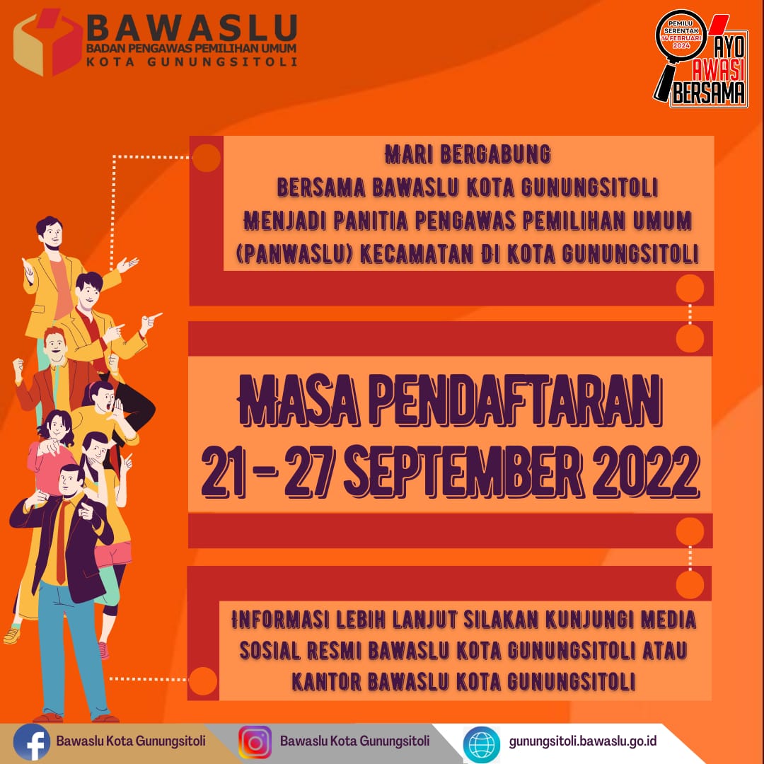 #SahabatBawaslu, Bawaslu Kota Gunungsitoli membuka Kesempatan bagi Putra-Putri terbaik Kota Gunungsitoli yang memenuhi persyaratan untuk mendaftarkan diri sebagai calon Panwaslu Kecamatan dalam Mengawal jalannya Demokrasi Pemilu 2024.