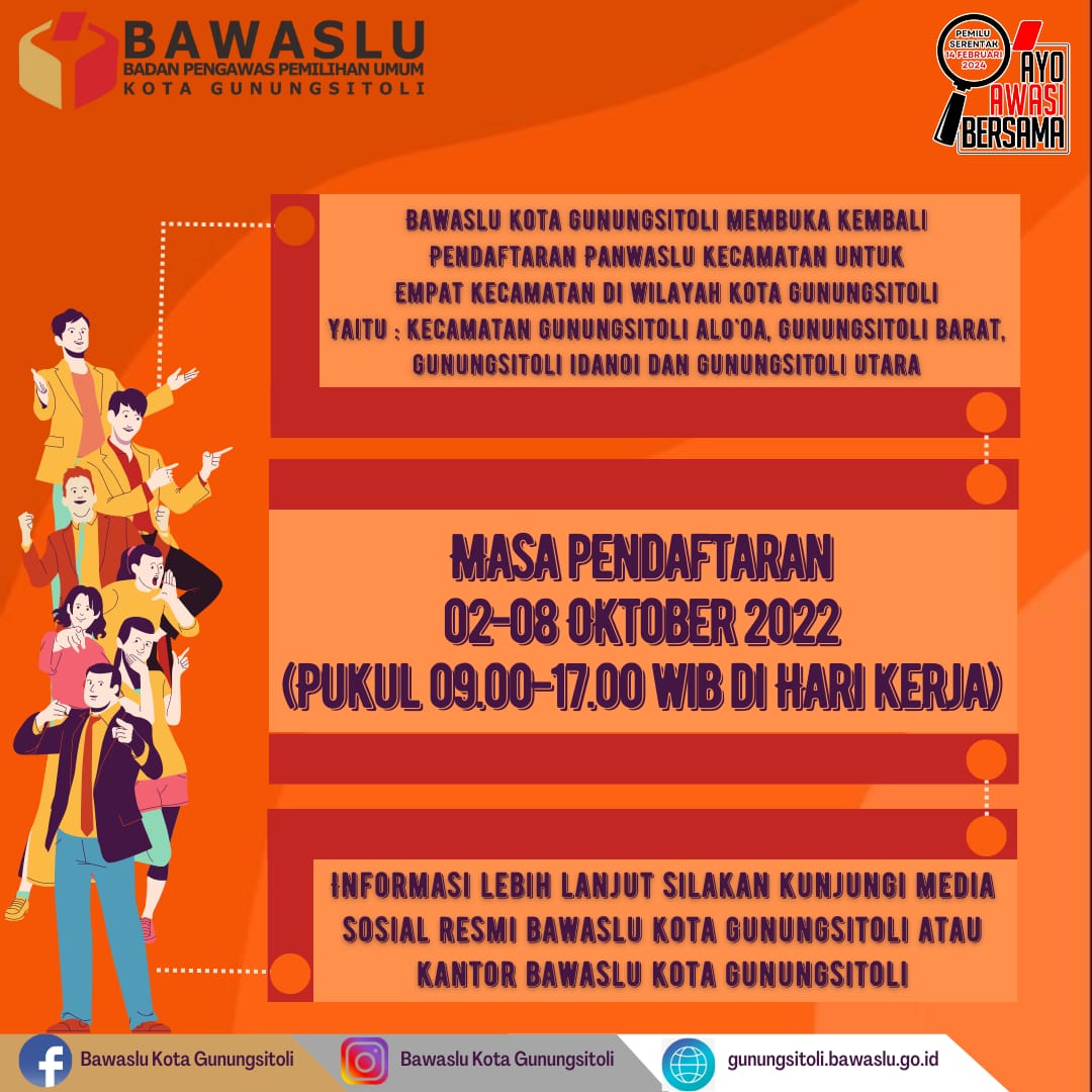 Gunungsitoli, 01/10/2022. Kelompok Kerja Pembentukan Panwaslu Kecamatan Kota Gunungsitoli membuka kembali Kesempatan bagi Warga Kota Gunungsitoli yang memenuhi persyaratan untuk mendaftarkan diri sebagai Calon Panwaslu Kecamatan.