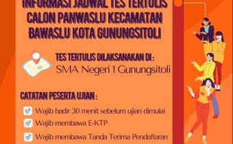 Berikut disampaikan jadwal pelaksanaan Ujian Tes Tertulis Calon Panwaslu Kecamatanklik link berikut : Jadwal >>>>>>>>>> Download