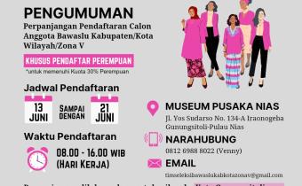 Sehubungan dengan belum tercapainya keterwakilan perempuan minimal 30% (tiga puluh persen) dari 2 (dua)  kali  kebutuhan pada masa pendaftaran calon  Anggota Panwaslu Kecamatan  Kota Gunungsitoli  pada  Pemilihan  Serentak Tahun  2024,    maka  Kelompok    Kerja  Pembentukan Panwaslu  Kecamatan  se-Kota Gunungsitoli berdasarkan Peraturan Sadan Pengawas Pemilihan Republik  Indonesia  Nomor  19  Tahun 2017  sebagaimana telah  beberapa  kali  diubah  terakhir dengan Peraturan Badan Pengawas Pemilihan  Umum Republik Indonesia  Nomor 4 Tahun 2022,  atas kewenangan yang diberikan oleh Undang-Undang Nomor 1   Tahun 2015 Tentang Penetapan Peraturan Pemerintah Pengganti Undang-Undang Nomor 1   Tahun 2014 Tentang Pemilihan Gubernur,  Bupati,  dan  Walikota  Menjadi  Undang-  Undang  sebagaimana  telah  beberapa  kali diubah  terakhir  dengan  Undang- Undang  Republik Indonesia  Nomor  6  Tahun  2020  Tentang Penetapan Peraturan Pemerintah Pengganti Undang-Undang Nomor 2 Tahun 2020 Tentang Perubahan  Ketiga  Atas  Undang-Undang Nomor  1   Tahun 2015  Tentang  Penetapan  Peraturan Pemerintah  Pengganti  Undang-Undang  Nomor  1     Tahun  2014  Tentang  Pemilihan  Gubernur, Supati, dan Walikota Mehjadi Undang-Undang', membuka kesempatan bagi pendaftar khusus perempuan yang memenuhi persyaratan untuk mendaftarkan diri sebagai calon anggota Panwaslu Kecamatan.